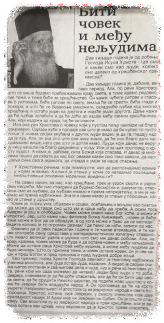 - Dve hiljade godina je, dabome, veliki period. Ali po reči Hristovoj, što se više budemo približavali kraju sveta, a tome idemo redovno, sve teže i teže biće za hrišćanstvo. On kaže čućete ratove i glasove o ratovima, biće ratovi po svetu, zemlja će se tresti, biće gladi i pomora, i što će se bezakonje umnožiti, ohladniće ljubav kod mnogih hrišćana i ustaće jedan na drugoga i izdaće jedan drugoga. Dalje kaže da će ljubav oslabiti i da će doći do izdaje među samim hrišćanima. Ali, koji izdrži do kraja, taj će se spasiti.