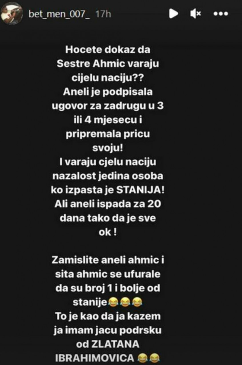 - Hoćete li dokaz da sestre Ahmić varaju celu naciju? Aneli je potpisala ugovor za "Zadrugu" u martu ili aprilu i od tada sprema priču svoju i varaju celu naciju. Nažalost, jedina osoba koja ispašta je Stanija, ali Aneli ispada za 20 dana, tako da je sve okej - napisao je Asmin na Instagramu.