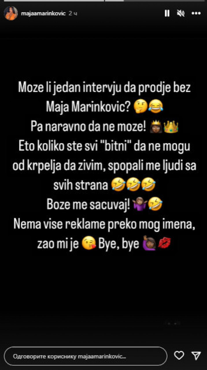 - Može li jedan intervju da prođe bez Maje Marinković? Pa naravno da ne može! Eto koliko ste vi ,,bitni" da ne mogu od krpelja da živim, spopali me ljudi sa svih strana. Bože me sačuvaj! Nema više reklame premo mog imena, žao mi je. Ćao, ćao - napisala je Maja na Instagramu.