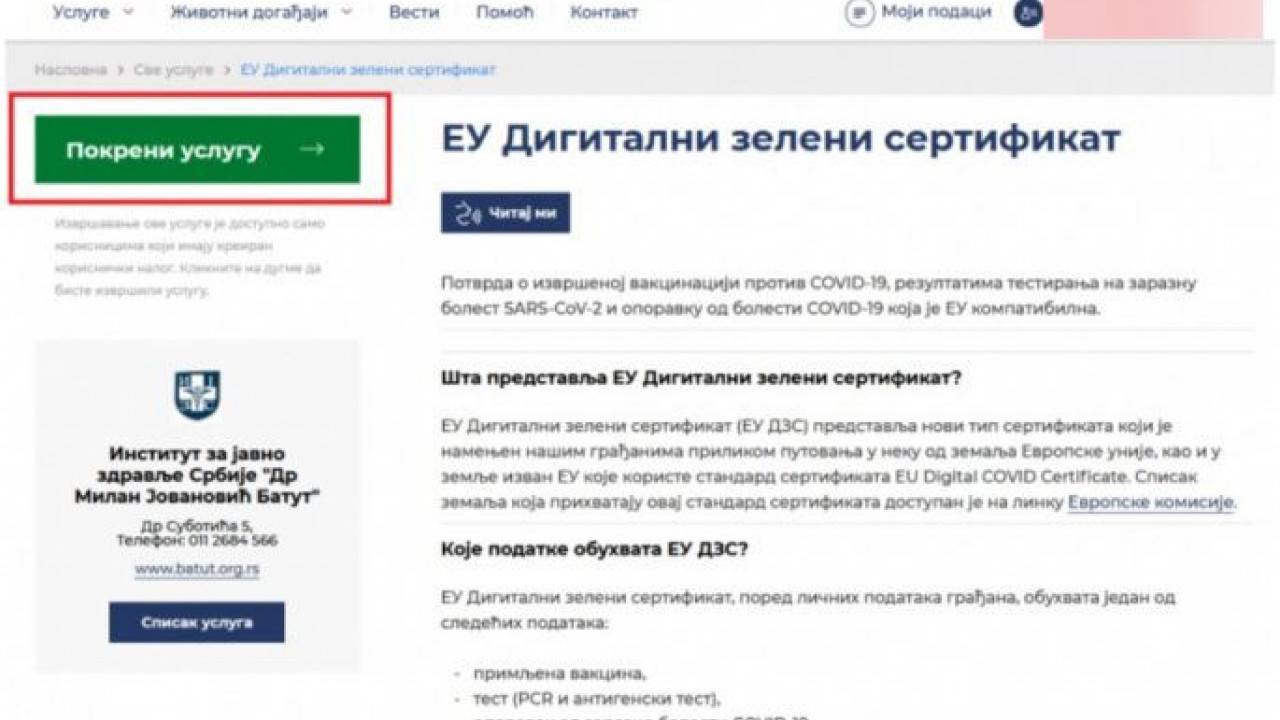 Kada uđete na svoj nalog, potrebno je da odaberete opciju EU digitalni zeleni sertifikat.