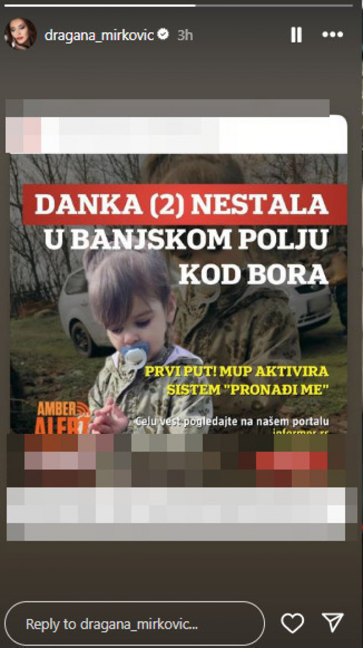 Nestanak dvogodišnje devojčice Danke od juče potresa javnost, a tim povodom oglasile su se i brojne poznate ličnosti, među kojima je i Dragana Mirković.