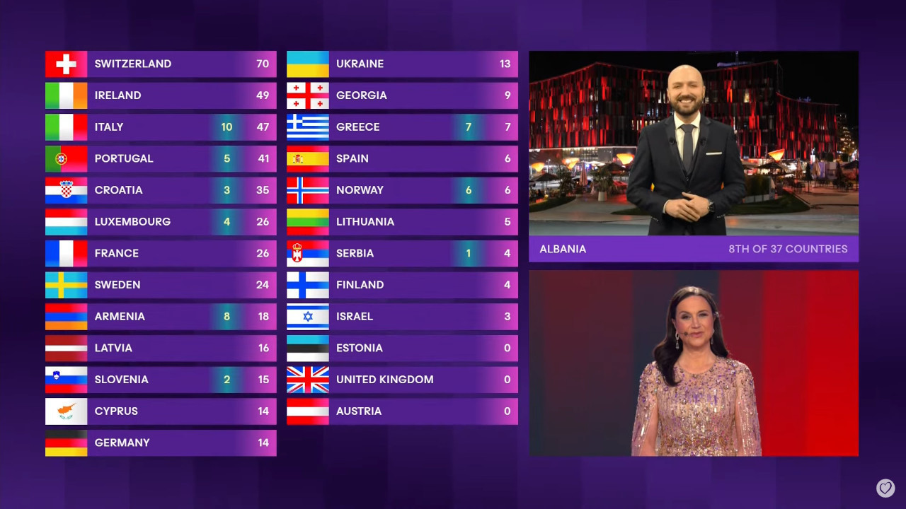 Albanija je najviše dala Švajcarskoj - maksimalnih 12, a Srbiji - jedan bod.