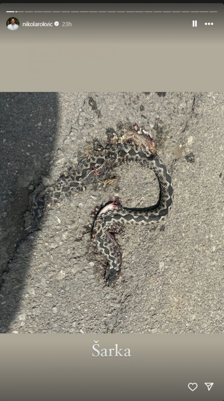 - Kakav li je ovo trag, nešto mi poznat, šarkica - govorio je Nikola u videu, a onda i pokazao sliku pregažene zmije na putu.