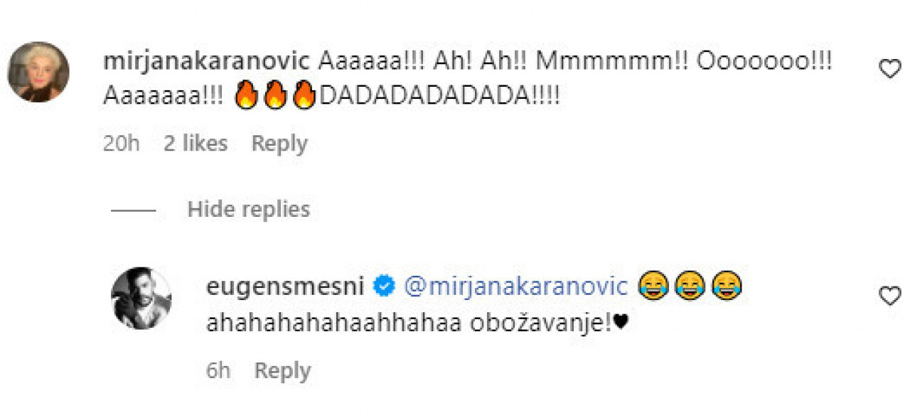 "Aaaa! Ah! Ah! Mmmmm! Oooo! Aaaa! Da, da, da, da, da!!!", napisala je Mirjana, na šta je on odgovorio:
