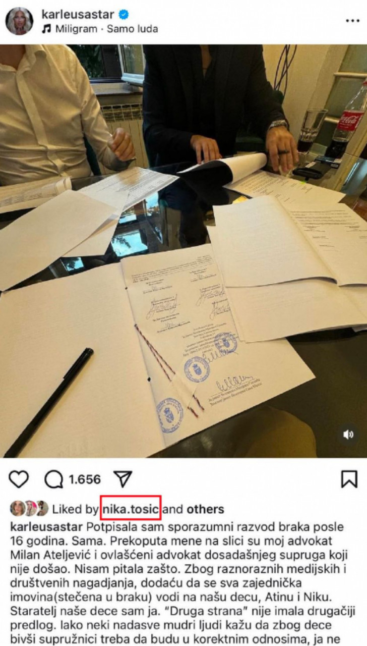 Nika Tošić, Jelenina i Duškova mlađa ćerka, lajkovala je njenu objavu u kojoj su detalji o Dušku i načinu na koji se poneo čak i na dan razvoda.
