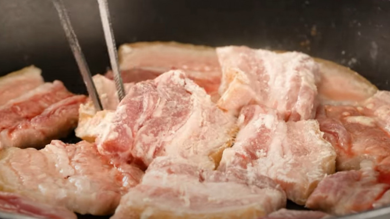 Tako će meso biti sočno i ukusno. Isecite komade svinjskog stomaka, pa ih uvaljajte u brašno i kiselu vodu. Posle potapanja u vodu počnite da pržite.