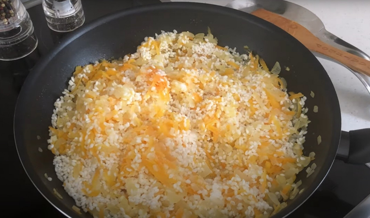 Ulje sipajte u veću šerpu, otprilike za debljinu prsta. Na ulju izdinstajte crni luk i praziluk. Pirinač potopite u vodu.