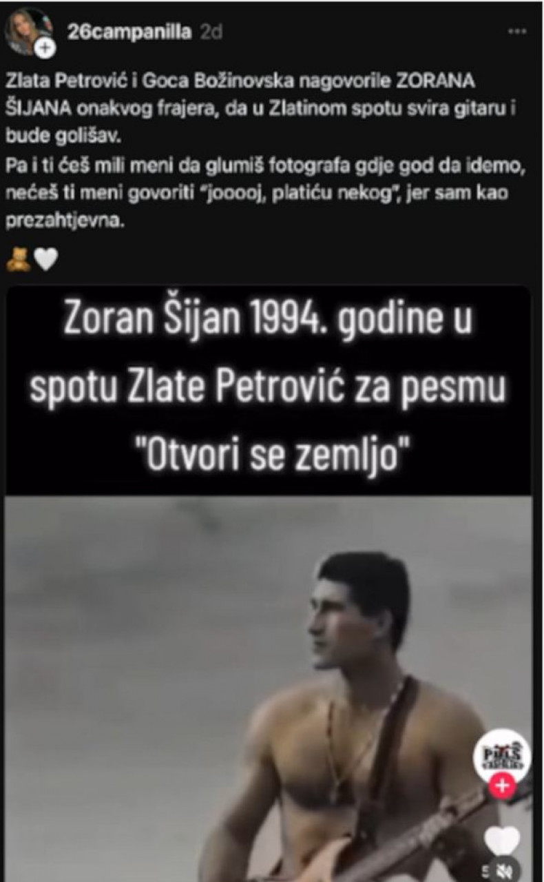 Jedna od korisnica "Threads-a", prokomentarisala je u svojoj objavi: "Zlata Petrović i Goca Božinovska nagovorile Zorana Šijana, onakvog frajera da u Zlatinom spotu svira gitaru i bude golišav. Pa i ti ćeš mili meni da glumiš fotografa gde god da idemo, nećeš ti meni govoriti 'jooooj platiću nekog', jer sam kao prezahtevna".